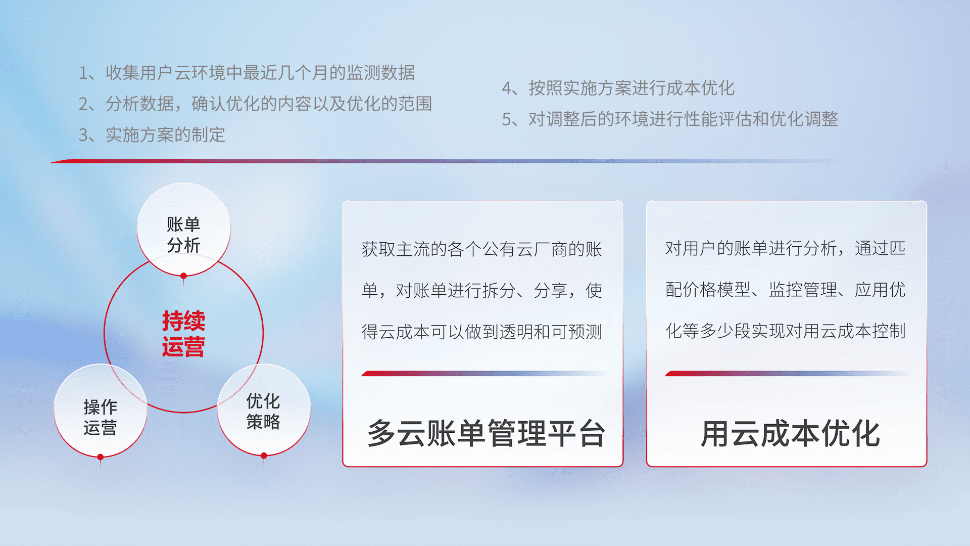 通过多云纳管,,,以统一的资源数据模型把客户的云资源进行抽象和封装,,进而实现对多云资源的统一操作,,,保障云资源管理的可靠性、、、稳定性与可用性。。。量身定制化运维内容,,,配置、、开发运维、、补丁管理、、备份、、、、监控、、、认证和访问管理、、、、审计和日常巡检等,,,保障在用云过程中的可靠度,,稳定度以及高可用率。。