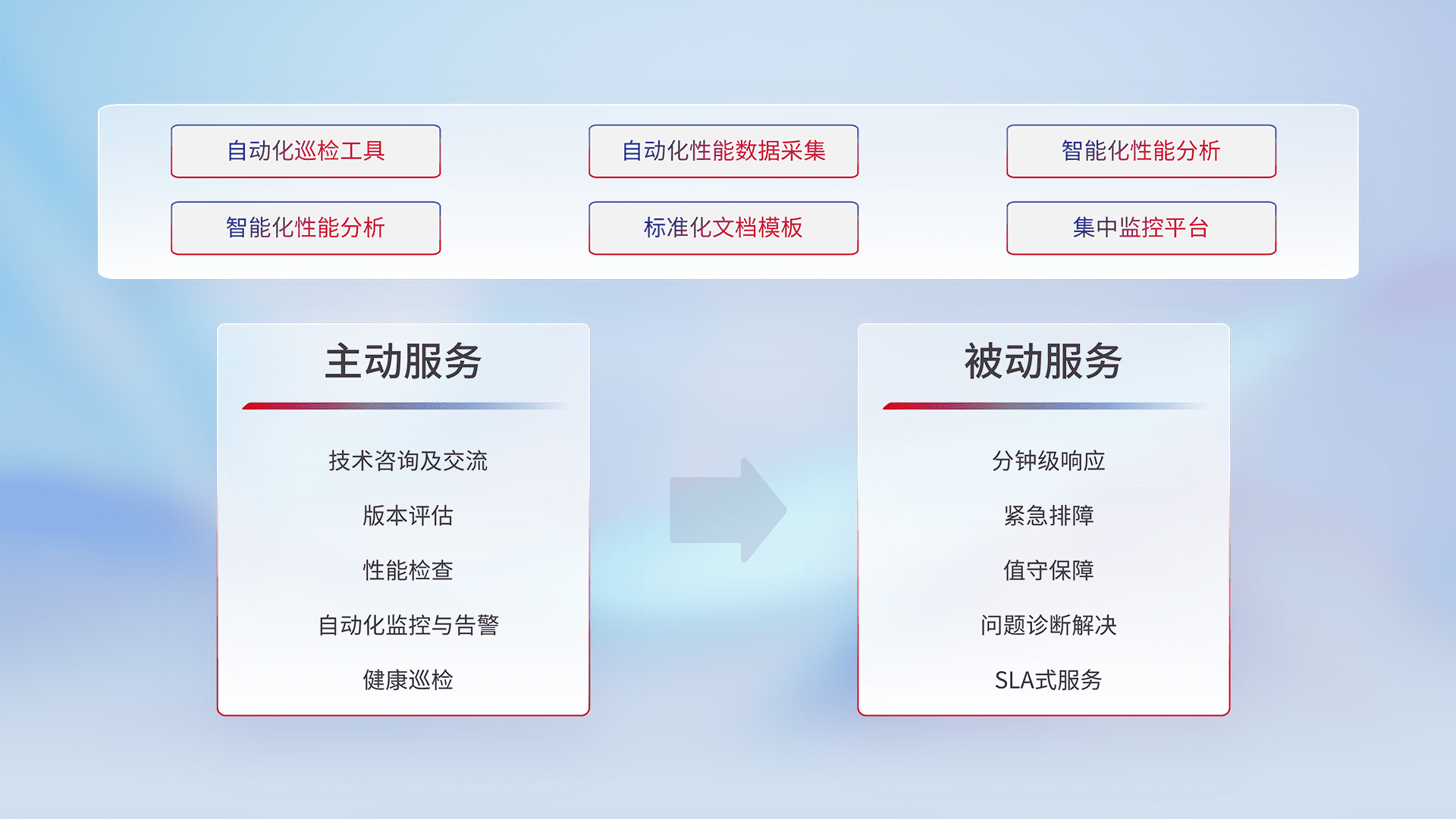 智能化工具和标准化文档,,,保障服务质量,,,提供主动服务(包含技术咨询、、版本评估、、、、性能检查、、自动化监控与告警、、、、健康巡检)和被动服务包含(分钟级响应、、紧急排障、、、值守保障、、、、问题诊断解决、、SLA服务)。。。。